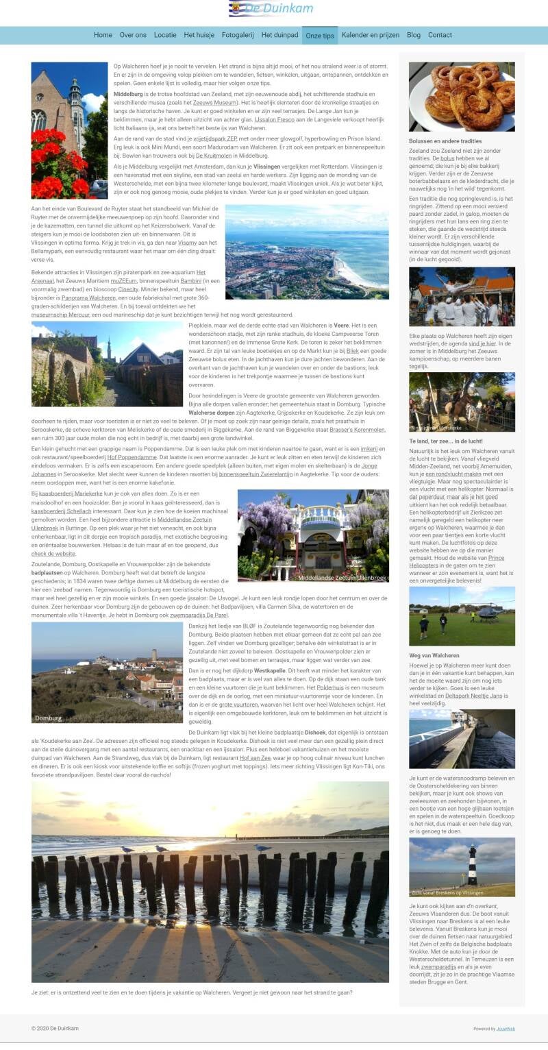 Geïnspireerd door een andere verhuurwebsite die ik tegenkwam heb ik m'n aanpak wat meer puntsgewijs gemaakt. Bij de woning vind je nu duidelijk opgesomd wat er allemaal aanwezig is. En bij onze tips zie je per categorie wat onze drie aanraders zijn. Verder is de pagina 'locatie' verdwenen. Ook daar stonden veel te veel woorden. De relevante kaartjes staan nu gewoon op de contactpagina.