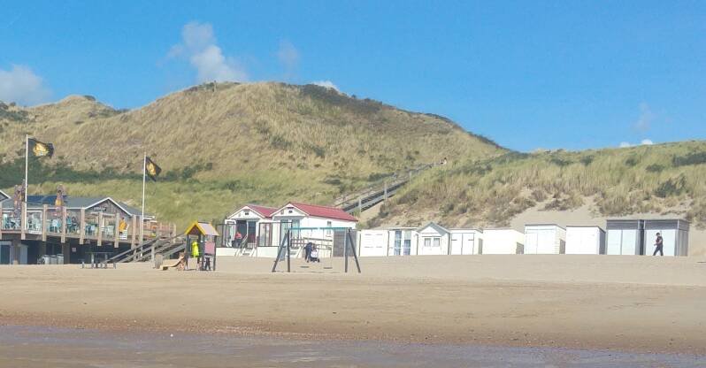 Het is gelukt om een strandcabine te bemachtigen pal naast de dichtstbijzijnde strandopgang! Het hele seizoen hebben we één van de witte hokjes die je hier op de foto ziet, vlak naast strandpaviljoen De Boomerang. En als gast van De Duinkam kun je die cabine erbij huren.
