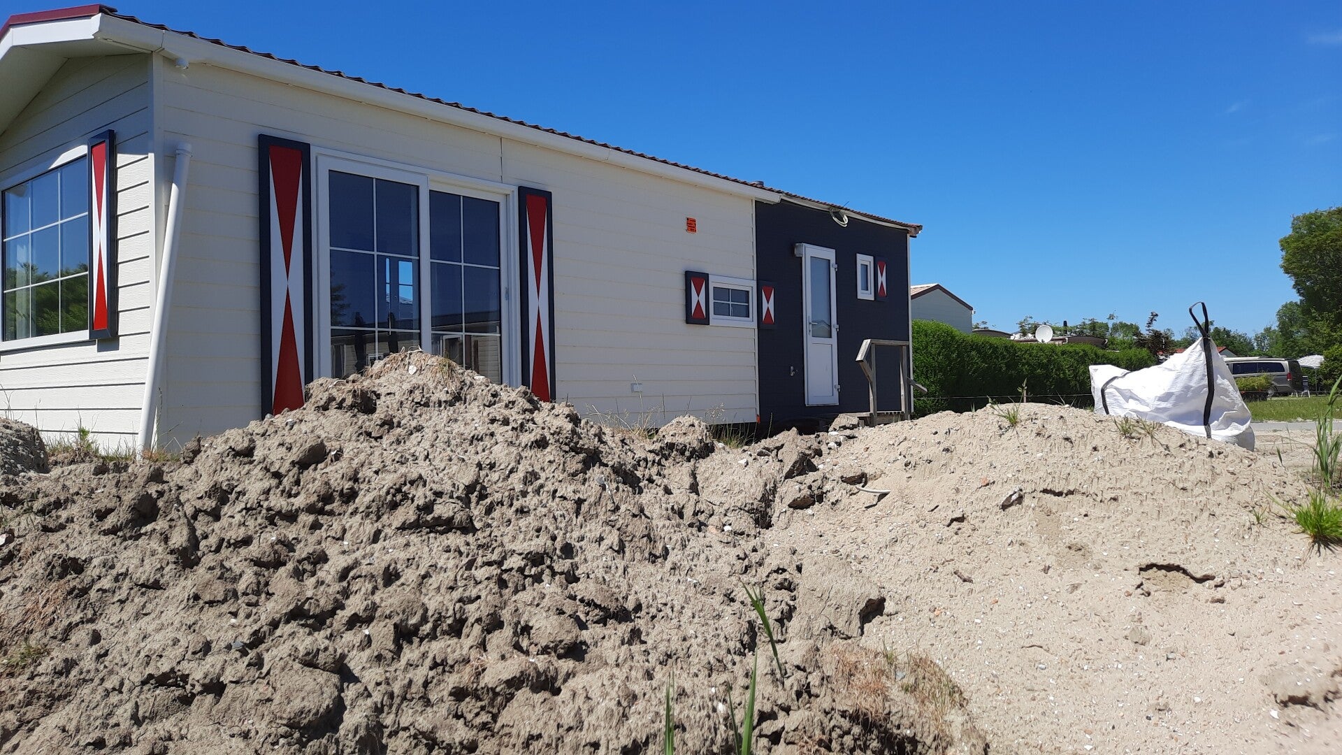 De vertraging bij de bouwer was ontstaan door leveringsproblemen met de bouwmaterialen. Blijkbaar zijn de spullen nu binnen en kan het chalet worden voltooid. Duinzicht regelt dat na de plaatsing in no-time de luifel wordt geplaatst, de leidingen worden aangesloten en dat daarna de tuin wordt aangelegd. In de tussentijd krijg ik vast de sleutel en kan ik de boel gaan inrichten.