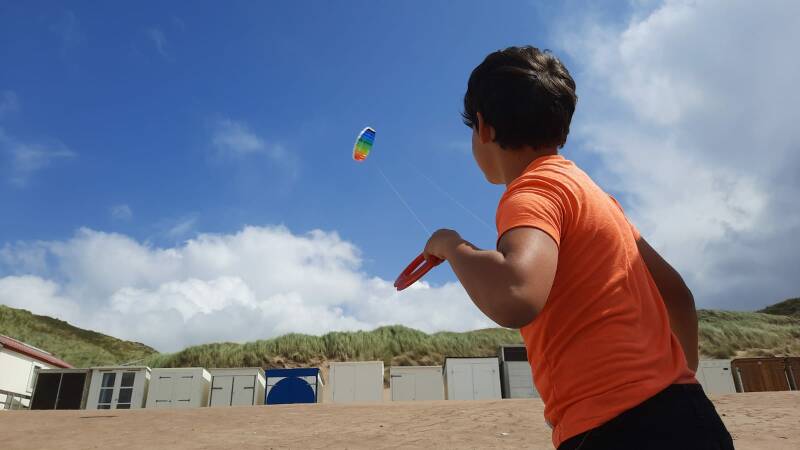 Maar ook als het plaatje wat minder perfect is, kun je je op het strand uitstekend vermaken. De afgelopen dagen hadden we bijvoorbeeld windkracht 6. Dat is te veel om met een handdoekje in het zand te gaan liggen (dan word je gezandstraald), maar je kunt er wel geweldig bij vliegeren! Op de foto zie je onze zoon Jonas met op de achtergrond de strandcabine (die met de ramen).