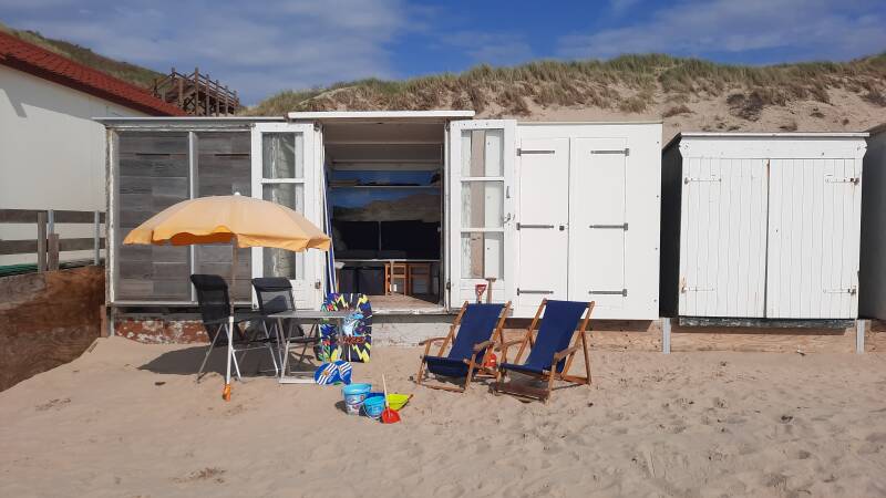 Los van De Duinkam in Serooskerke verhuren we strandcabine 't Hulletje bij Dishoek. Zeeuwen noemen het een kotje. Het staat op (volgens ons) het fijnste strand van Walcheren, ongeveer 13 kilometer van De Duinkam vandaan. 't Hulletje staat vlak naast strandpaviljoen De Botanist aan Zee, waar je voor redelijke prijzen heerlijk kunt eten. Bij het afhaalloket kun je supergoede friet kopen (tip: met satésaus), die je bij het kotje kunt eten.
